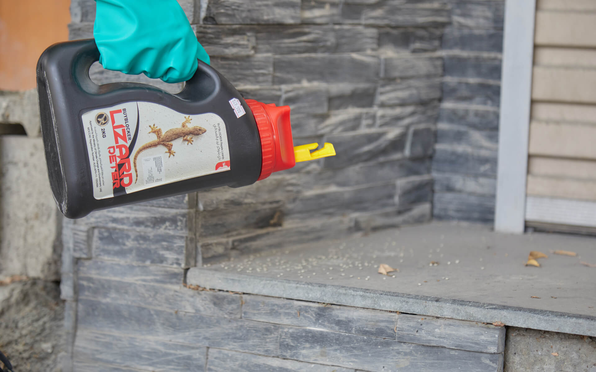 Our odorless, eco-friendly lizard repellent spray is applied to walls, vents, balconies, and window areas where lizards enter or rest.
